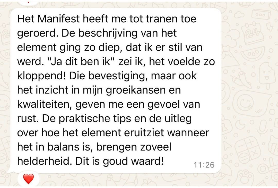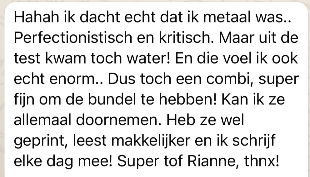 “Hahah ik dacht echt dat ik metaal was.. Perfectionistisch en kritisch. Maar uit de test kwam toch water! En die voel ik ook echt enorm.. Dus toch een combi, super fijn om de bundel te hebben! Kan ik ze allemaal doornemen. Heb ze wel geprint, leest makkelijker en ik schrijf elke dag mee!”